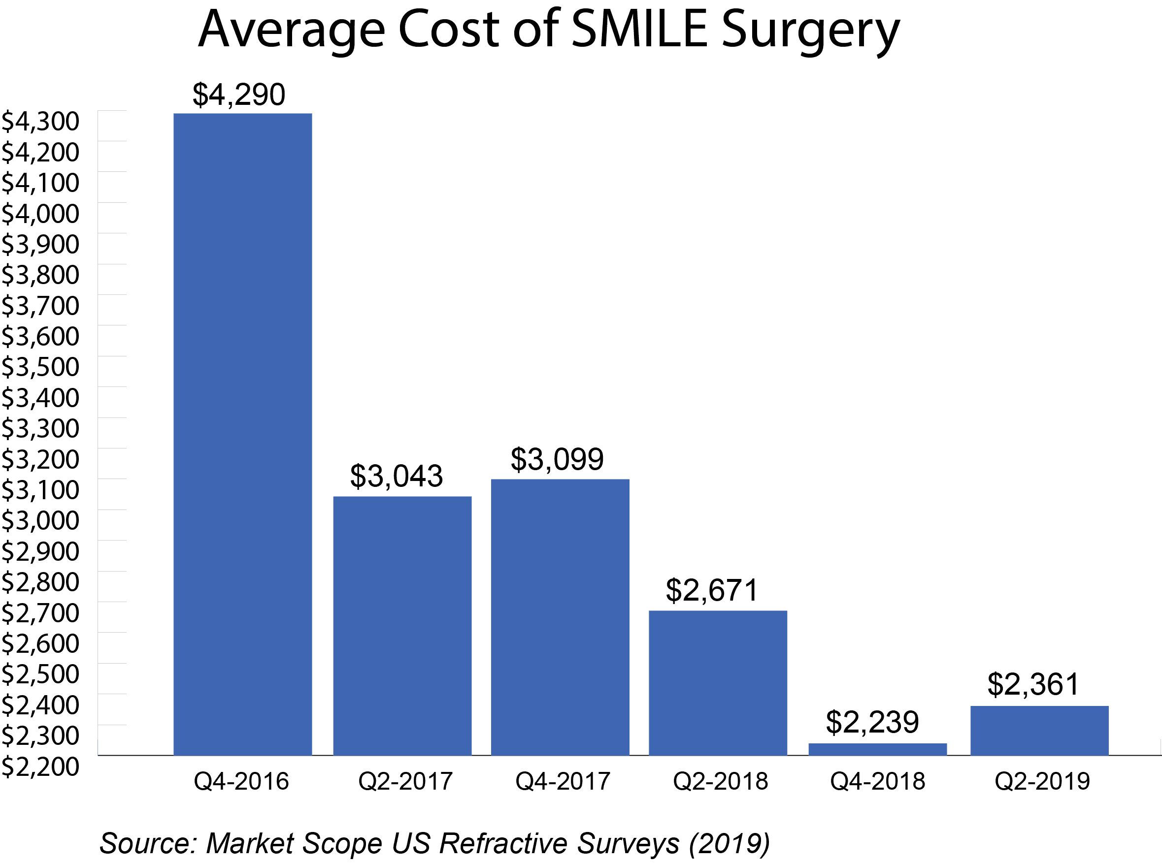 Most U.S. refractive eye surgeons charge about the same price for SMILE eye surgery as they do for all-laser LASIK — somewhere in the range of $2,000 to $3,000 per eye.